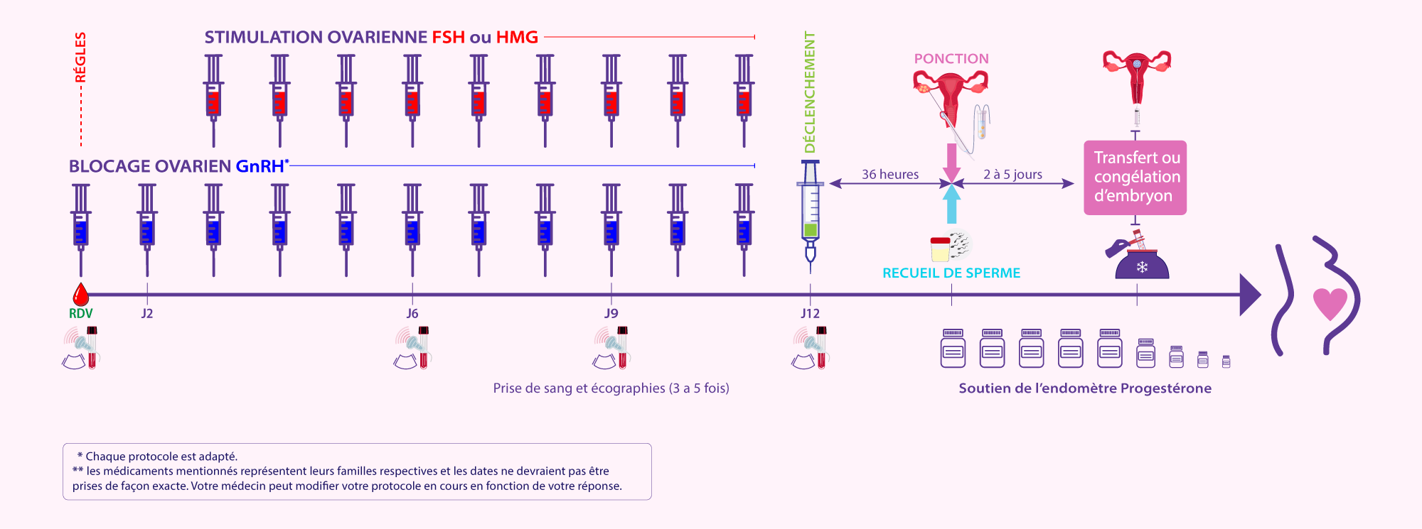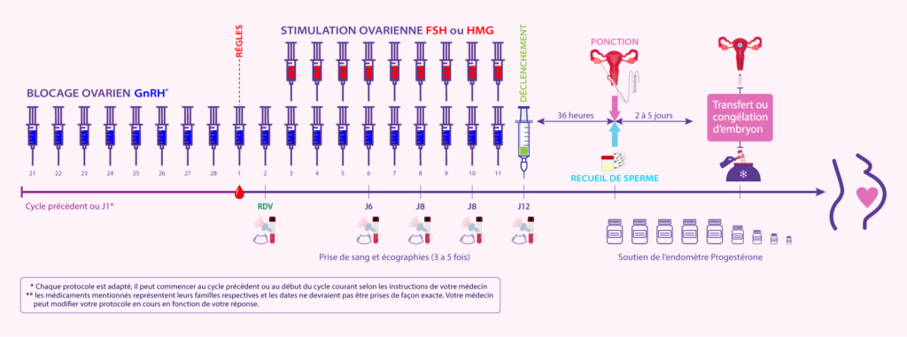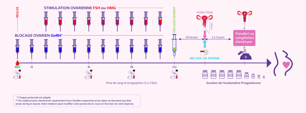 Il faut généralement entre 8 et 12 jours de gonadotrophines pour que les plus gros follicules atteignent la taille correcte pour le déclenchement. La procédure de ponction des ovocytes est généralement effectuée 36 heures après le déclenchement.