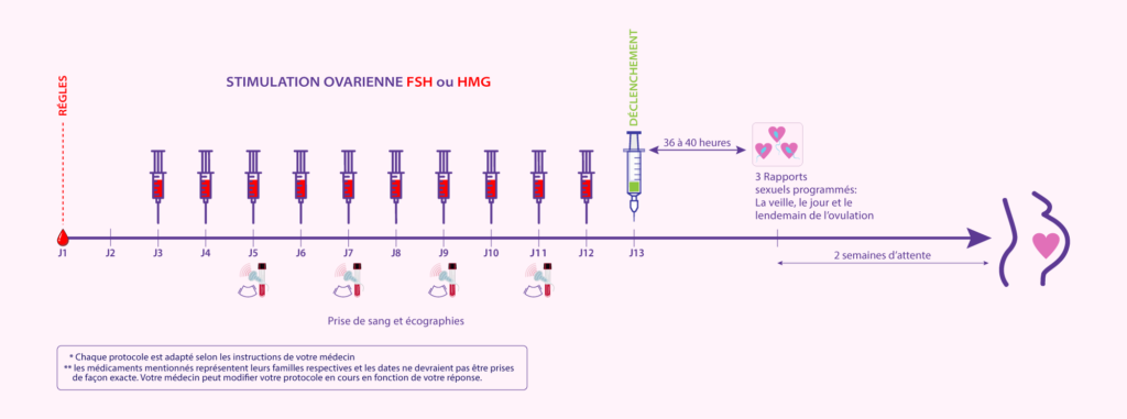 Ce type de stimulation permet de programmer précisément les dates soit des rapports sexuels, soit d'un cycle d'insémination artificielle avec un échantillon de sperme traité au laboratoire. Ceci consiste à stimuler UN ou DEUX follicules pour éviter les grossesses multiples.